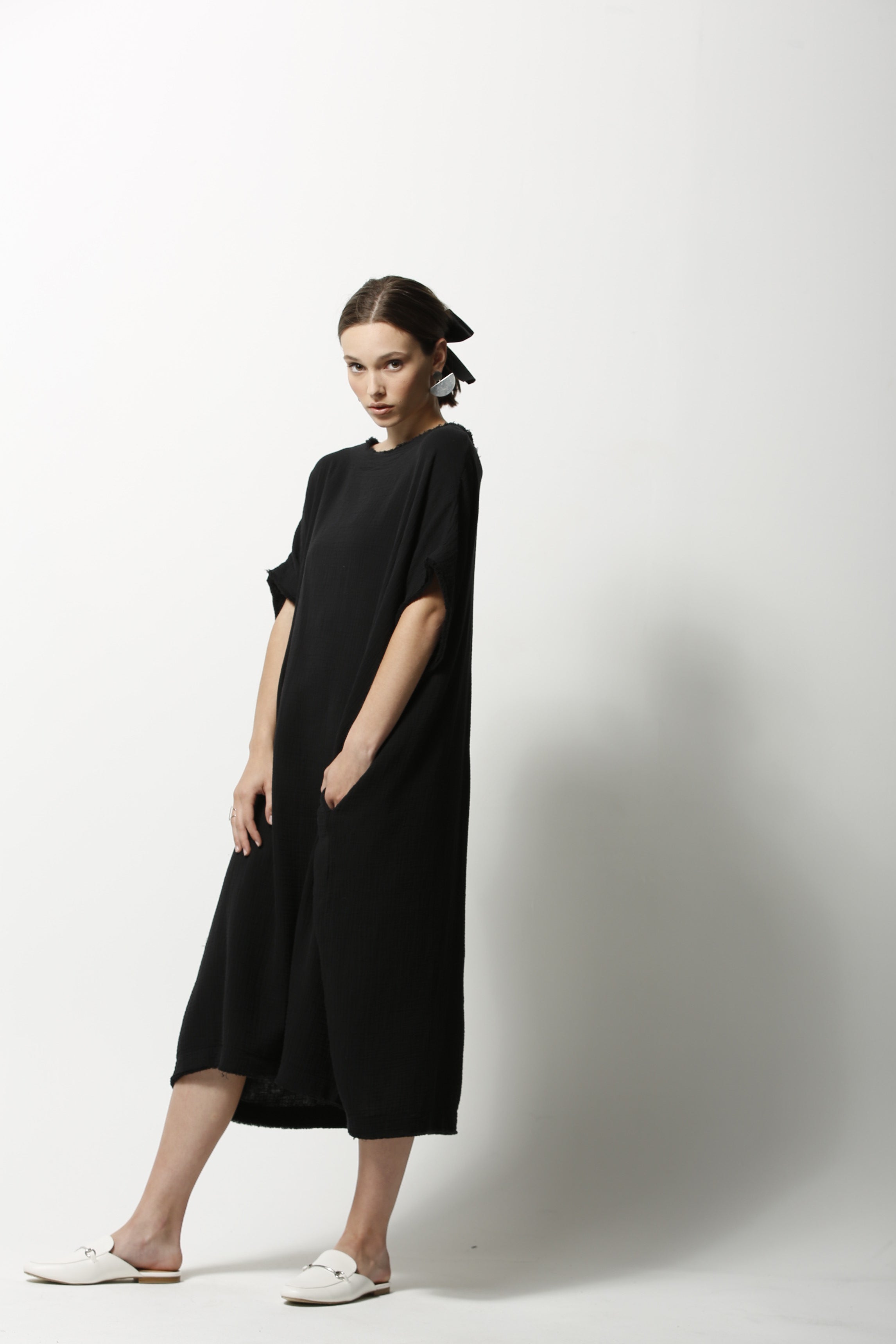 Sometimes the simplest designs make the best fashion statements. This breezy cotton maxi dress proves that point with its relaxed caftan silhouette and thoughtful details that just work. The double-layer crinkle gauze fabric moves with you while raw-edge finishing on the neckline and sleeves adds an artisanal touch. Hidden side pockets (yes, pockets!) and an adjustable tie belt let you customize the fit and function to your liking. Whether you're heading to brunch or the beach, this versatile piece transitions effortlessly from casual to polished - just switch up your accessories and you're ready to go.